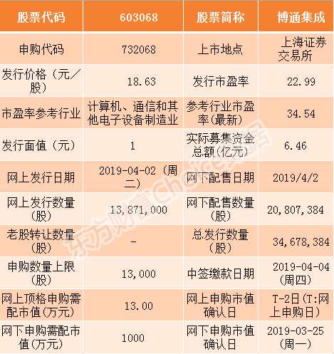 博通集成此次發(fā)行總數(shù)約3467.84萬股,網(wǎng)上發(fā)行1387.1萬股,發(fā)行市盈率22.99倍,申購代碼為:732068,申購價格:18.63元,單一帳戶申購上限1.3萬股,申購數(shù)量1000股整數(shù)倍。