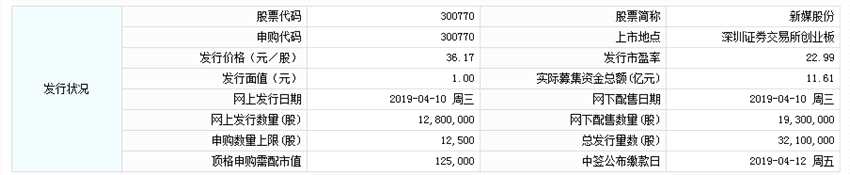 據(jù)交易所公告,【新媒股份(300770)、股吧】今日申購,此次發(fā)行總股數(shù)為32,100,000股,申購代碼:300770,申購價格:36.17元,單一賬戶申購上限1.25萬股,頂格申購需配市值12.5萬元。