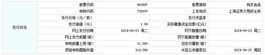 據(jù)交易所公告,【有友食品(603697)、股吧】今日申購,申購代碼:732697,申購價(jià)格:7.87 元/股,單一賬戶申購上限3.1萬股,頂格申購需配市值31萬元。