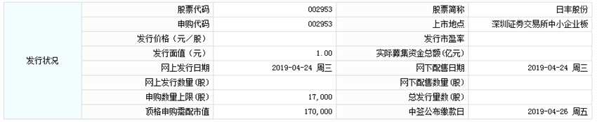 據(jù)交易所公告,【日豐股份(002953)、股吧】今日申購,本次公開發(fā)行股份4302萬股,申購代碼:002953,申購價(jià)格:10.52元/股,單一賬戶申購上限1.7萬股,頂格申購需配市值17萬元。