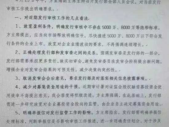 摘要: 周五,一則關(guān)于證監(jiān)會(huì)要求“加快IPO、再融資審核速度,確保每周至少4家IPO企業(yè)批文”的消息在市場(chǎng)不脛而走。消息稱,證監(jiān)會(huì)對(duì)近期的新股發(fā)行審核工作要求“放寬盈利條件,明確發(fā)行審核中不存在5000萬元、
