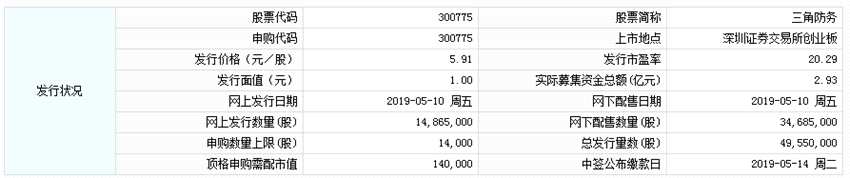 據交易所公告,三角防務今日申購,本次公開發(fā)行股份49,550,000股,申購代碼:300775,申購價格:5.91元/股,單一賬戶申購上限1.4萬股,頂格申購需配市值14萬元。