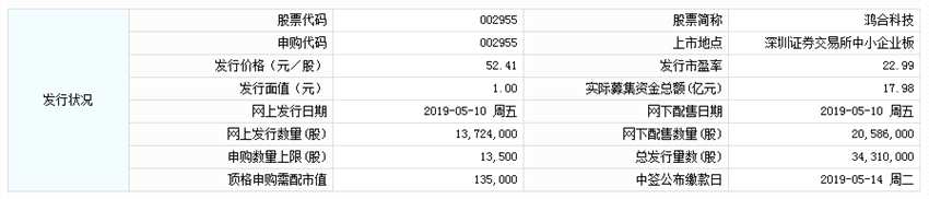 據交易所公告,鴻合科技今日申購,本次公開發(fā)行股份34,310,000股,申購代碼:002955,申購價格:52.41元/股,單一賬戶申購上限1.35萬股,頂格申購需配市值13.5萬元。