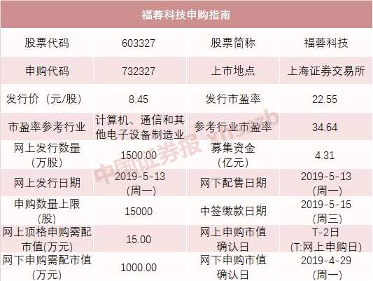 摘要: 今天(5月13日)滬深兩市迎來(lái)2只新股申購(gòu),分別是滬市主板的福蓉科技(申購(gòu)代碼:732327)和創(chuàng)業(yè)板的惠城環(huán)保(申購(gòu)代碼:300779)。福蓉科技和惠城環(huán)保的發(fā)行價(jià)分別為8.45元/股、13.59元
