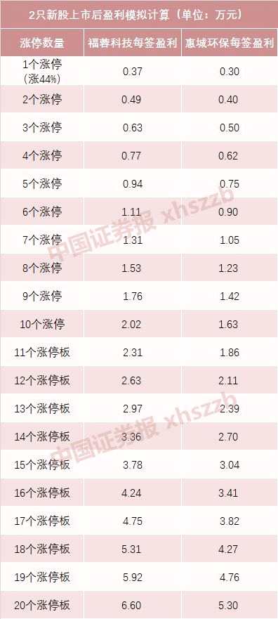 如果福蓉科技和惠城環(huán)保上市后,能達(dá)到今年以來(lái)上市新股的平均水平——7個(gè)漲停板的話,則每簽獲利分別約為1.31萬(wàn)元、1.05萬(wàn)元。