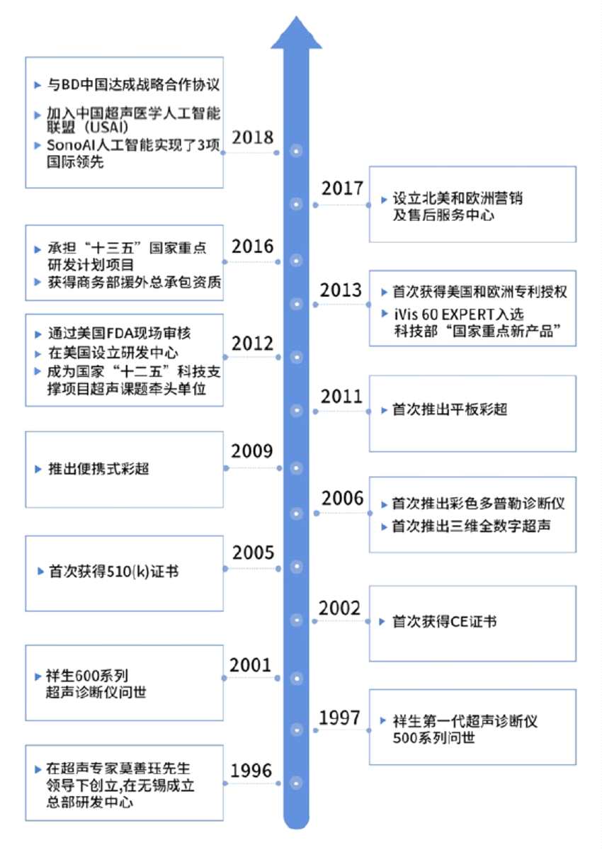 祥生醫(yī)療成立于1996年,第二年便推出了祥生第一代超聲診斷儀500系列;2006年,公司首次推出彩色多普勒診斷儀以及三維全數(shù)字超聲;2011年,首次推出平板彩超。