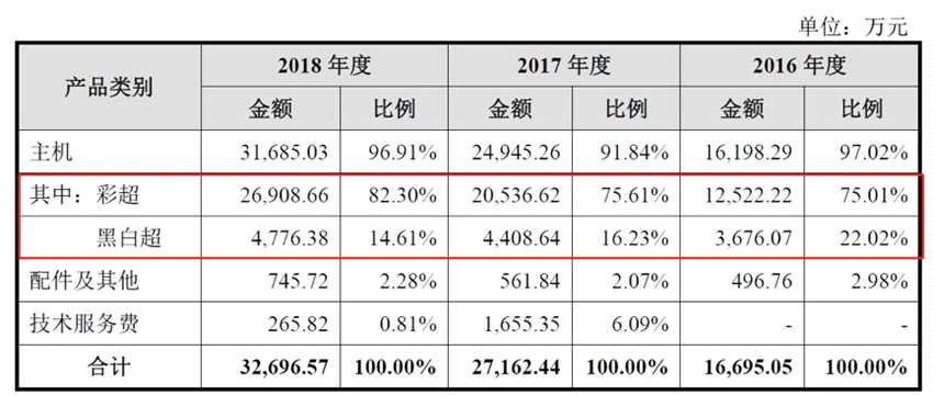 從下表祥生醫(yī)療近三年的營收構(gòu)成可以看到,高價值的彩超設(shè)備占營收的比例持續(xù)提升,從2016年75.01%上升到2018年82.30%,年銷售金額從1.25億上升到了2.69億。
