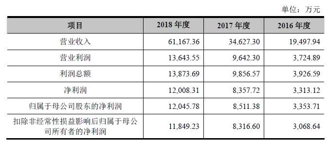 2016-2018年,羅曼股份營業(yè)收入分別為1.95億元、3.46億元和6.12億元,凈利潤分別為3,313.12萬元、8,357.72萬元和1.20億元。