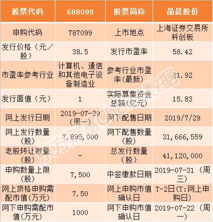 晶晨股份此次發(fā)行總數(shù)4112萬股,網(wǎng)上發(fā)行789.5萬股,發(fā)行市盈率58.42倍,申購代碼為:787099,發(fā)行價(jià)格:38.50元,單一帳戶申購上限7500股,申購數(shù)量為500股整數(shù)倍,網(wǎng)上頂格申購需配市值7.5萬元。