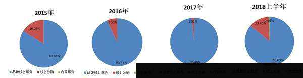 2018年更新的預(yù)披露信息中,當(dāng)年1-6月,品牌線上服務(wù)收入占主營業(yè)務(wù)收入比例86.09%、線上分銷占主營業(yè)務(wù)收入比例13.45%、內(nèi)容服務(wù)占主營業(yè)收入比例0.46%。