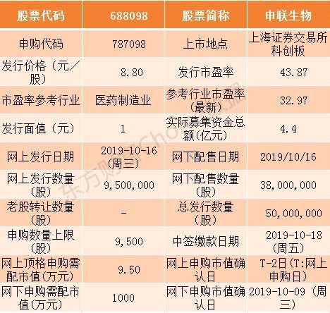 申聯(lián)生物此次發(fā)行總數(shù)5000萬股,網(wǎng)上發(fā)行950萬股,發(fā)行市盈率43.87倍,申購(gòu)代碼為:787098,發(fā)行價(jià)格:8.80元,單一帳戶申購(gòu)上限9500股,申購(gòu)數(shù)量為500股整數(shù)倍,網(wǎng)上頂格申購(gòu)需配市值9.5萬元。