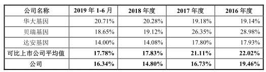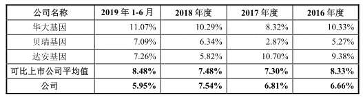 2015年至2019年1-6月,公司綜合毛利率低于可比公司綜合毛利率平均水平。諾禾致源綜合毛利率分別為52.38%、48.00%、42.81%、42.89%和37.52%,同行業(yè)公司毛利率均值分別為51.14%、54.88%、53.74%、51.73%、56.65%。
