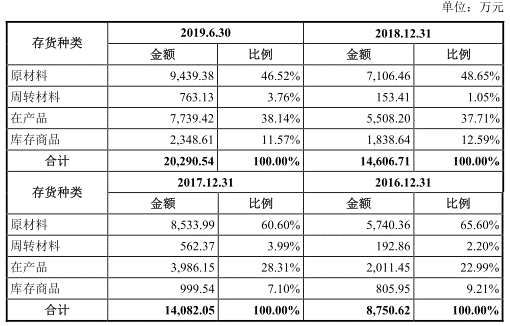 2015年至2019年6月30日,諾禾致源存貨金額分別為3918.61萬元、8750.62萬元、1.41億元、1.46億元和2.03億元,占流動資產(chǎn)的比例分別為9.85%、8.56%、19.99%、21.45%和24.65%。
