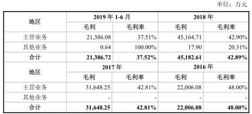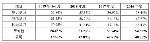 2015年至2019年1-6月,諾禾致源綜合毛利率分別為52.38%、48.00%、42.81%、42.89%和37.52%。