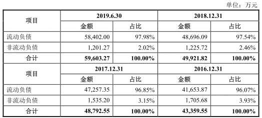2015年至2019年6月30日,諾禾致源負(fù)債總額分別為4.40億元、4.34億元、4.88億元、4.99億元、5.96億元,資產(chǎn)負(fù)債率(合并)分別為91.56%、35.34%、36.07%、33.93%、37.19%。