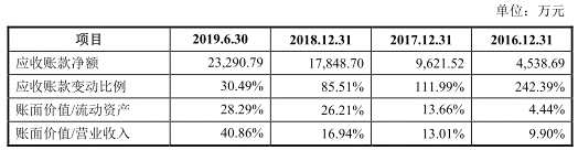 2015年至2019年6月30日,諾禾致源應(yīng)收賬款賬面價值分別為1325.60萬元、4538.69萬元、9621.52萬元、1.78億元和2.33億元,占流動資產(chǎn)的比例分別為3.33%、4.44%、13.66%、26.21%和28.29%,占營業(yè)收入的比例分別為4.28%、9.90%、13.01%、16.94%和40.86%。