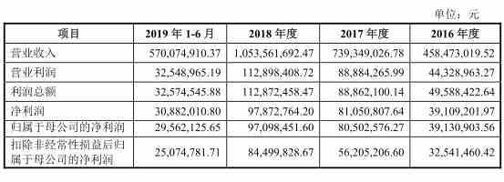 2015年至2019年1-6月,諾禾致源實現(xiàn)營業(yè)收入分別為3.10億元、4.58億元、7.39億元、10.54億元、5.70億元,實現(xiàn)歸屬于母公司的凈利潤分別為2478.87萬元、3913.09萬元、8050.26萬元、9709.85萬元、2956.21萬元。