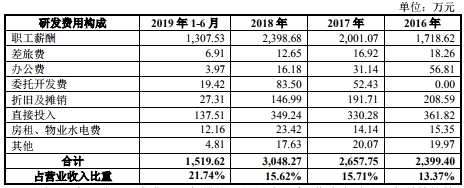 2016年至2019年1-6月,大智慧研發(fā)費(fèi)用分別為1.61億元、1.36億元、1.08億元和4991.94萬元,占公司營業(yè)收入的比例分別為14.28%、21.29%、18.27%和17.22%。