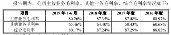 據(jù)招股說明書,2016年至2019年1-6月,財(cái)富趨勢(shì)綜合毛利率分別為88.83%、87.29%、87.24%和80.17%,主營業(yè)務(wù)毛利率分別為88.97%、87.48%、87.35%和80.26%。