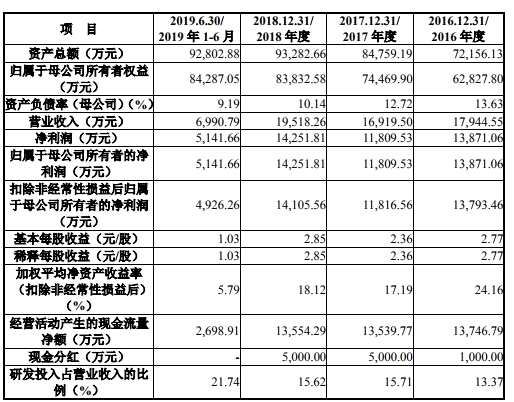 2016年至2019年6月,財(cái)富趨勢(shì)歸屬于母公司所有者的凈利潤分別為1.39億元、1.18億元、1.43億元、5141.66萬元;經(jīng)營活動(dòng)產(chǎn)生的現(xiàn)金流量?jī)纛~分別為1.37億元、1.35億元、1.36億元、2698.91萬元。