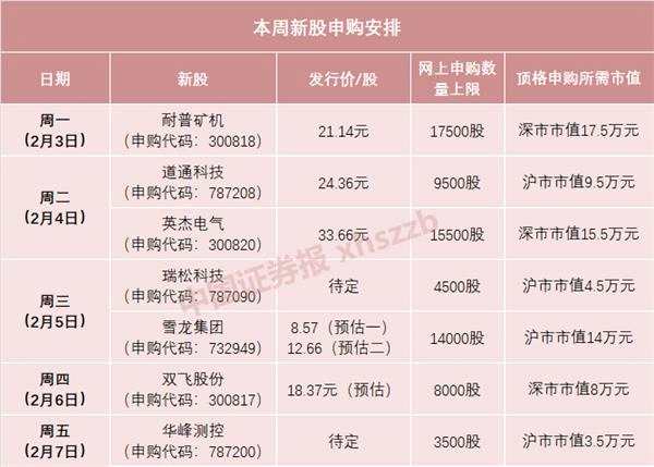 摘要: 本周,滬深兩市將迎來7只新股申購,這也是春節(jié)后第一批新股申購。其中,創(chuàng)業(yè)板3只,分別是周一的耐普礦機、周二的英杰電氣、周四的雙飛股份;滬市主板1只,是周三的雪龍集團;科創(chuàng)板3只,分別是周二的道通科技、