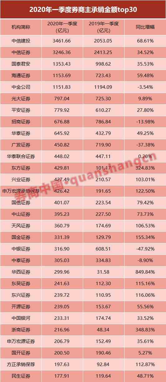 具體來看,中信證券和中信建投證券主承銷規(guī)模大幅超出其他同業(yè),二者幾乎難分伯仲。一季度主承銷規(guī)模中,中信建投證券反超中信證券,以3461.66億元暫居行業(yè)第一,同比增幅68.61%;中信證券以3246.36億元的規(guī)模暫居第二,同比增幅34.52%。國泰君安、海通證券、中金公司一季度主承銷規(guī)模均超千億,躋身行業(yè)前五。