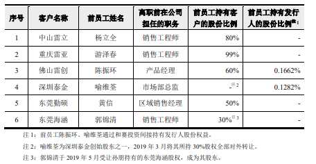 雷賽智能存在前員工持有客戶權益(以下簡稱“前員工客戶”)情形,分別為中山市雷立機電有限公司(以下簡稱“中山雷立”)、重慶雷亞機電有限公司(以下簡稱“重慶雷亞”)、佛山市雷創(chuàng)智能科技有限公司(以下簡稱“佛山雷創(chuàng)”)、深圳市泰金智能有限公司(以下簡稱“深圳泰金”)、東莞市勤碩智能科技有限公司(以下簡稱“東莞勤碩”)及東莞市海涵自動化設備有限公司(以下簡稱“東莞海涵”)。