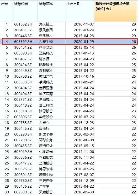 不只是三人行,近期萬泰生物也為中新股的投資者帶來了不菲收益。萬泰生物上市后,連續(xù)26個一字漲停,投資者中一簽可賺13.13萬元。萬泰生物也稱為2014年新股IPO改革后,連續(xù)一字漲停數(shù)僅次于暴風(fēng)集團(tuán)、樂凱新材、海天精工的新股,后3只新股均有29個一字漲停板。