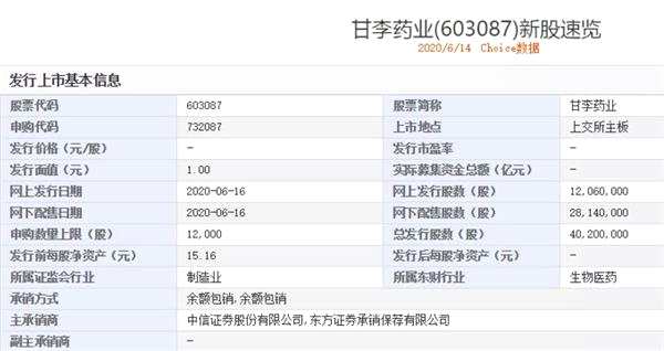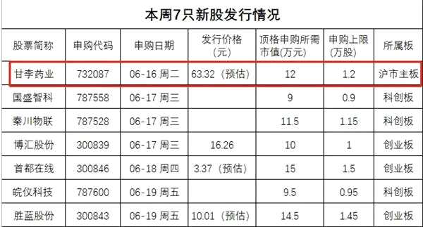 周二(6月16日),滬市主板甘李藥業(yè)發(fā)行;