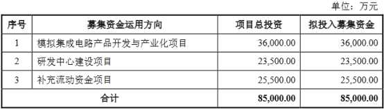 思瑞浦本次擬公開發(fā)行股票數(shù)量2000萬股,占發(fā)行后總股本的25%,發(fā)行后總股本8000萬股。其擬募集資金3.19億元,擬分別用于投資建設(shè)模擬集成電路產(chǎn)品開發(fā)與產(chǎn)業(yè)化項(xiàng)目、研發(fā)中心建設(shè)項(xiàng)目和補(bǔ)充流動(dòng)資金項(xiàng)目。