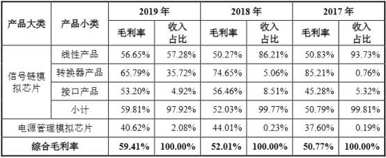 報(bào)告期內(nèi),思瑞浦綜合毛利率分別為50.77%、52.01%和59.41%。該公司營(yíng)業(yè)收入主要由信號(hào)鏈模擬芯片的收入構(gòu)成,故其綜合毛利率主要受信號(hào)鏈產(chǎn)品毛利率變動(dòng)影響。該公司主要產(chǎn)品為高性能模擬芯片,分為信號(hào)鏈模擬芯片和電源管理模擬芯片兩大類。