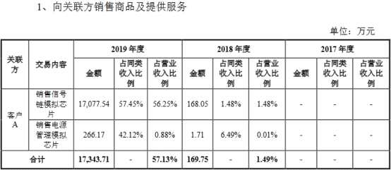 其中,未披露公司名稱的客戶A頗為神秘??蛻鬉為思瑞浦關(guān)聯(lián)方,2019年一躍成為思瑞浦第一大客戶,思瑞浦對(duì)其銷售金額1.73億元,在營(yíng)收中占比高達(dá)57.13%。深圳中興康訊亦為中興公司關(guān)聯(lián)公司,思瑞浦2019年對(duì)其銷售金額1284.89萬元,在營(yíng)收中占比4.23%。