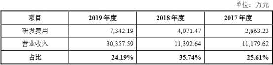 2017年至2019年,思瑞浦的研發(fā)費(fèi)用為2863.23萬元、4071.47萬元和7342.19萬元,呈持續(xù)上升的趨勢(shì),分別占同期營(yíng)業(yè)收入的比例分別為25.61%、35.74%和24.19%。