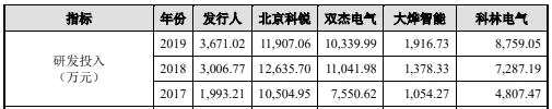 宏力達研發(fā)費用率一路下滑,但同行一路上升。從研發(fā)費用金額來看,宏力達研發(fā)費用遠低于北京科銳、雙杰電氣、【科林電氣(603050)、股吧】,僅高于大燁智能。2017年-2019年,北京科銳研發(fā)費用分別為1.05億元、1.26億元、1.19億元,雙杰電氣分別為0.76億元、1.10億元、1.03億元,大燁智能分別為1054.27萬元、1378.33萬元、1916.73萬元,科林電氣分別為4807.47萬元、7287.19萬元、8759.05萬元。