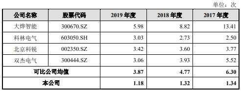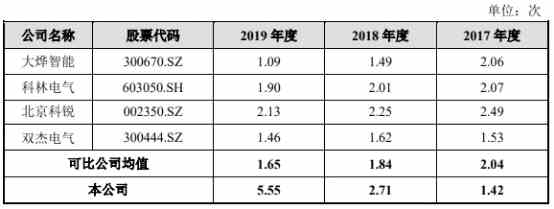 宏力達2017年度至2019年度,應(yīng)收賬款周轉(zhuǎn)率分別為1.42、2.71和5.55;同行可比公司均值分別為2.04、1.84、1.65。