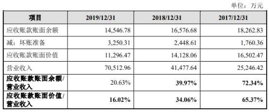 2017年-2019年,宏力達應(yīng)收賬款賬目余額分別為1.83億元、1.66億元和1.45億元,占營業(yè)收入的比例分別為72.34%、39.97%和20.63%。