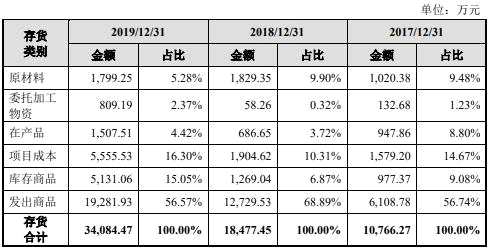 2017年-2019年,宏力達存貨金額分別為1.08億元、1.85億元及3.41億元,占流動資產(chǎn)的比例較高,分別為20.75%、24.08%和38.49%。
