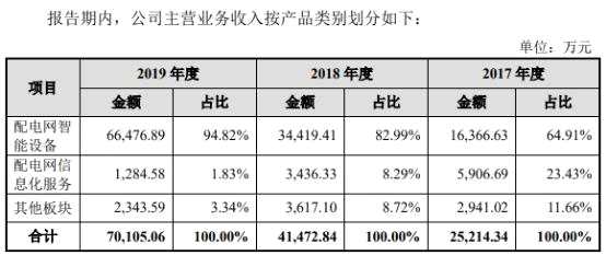 宏力達主要從事配電網(wǎng)智能設(shè)備的研發(fā)、生產(chǎn)和銷售。智能柱上開關(guān)為宏力達最為核心的產(chǎn)品,2017年-2019年,智能柱上開關(guān)的銷售額分別為4871.30萬元、2.65億元和5.66億元,分別占營業(yè)收入的19.30%、63.90%和80.33%。