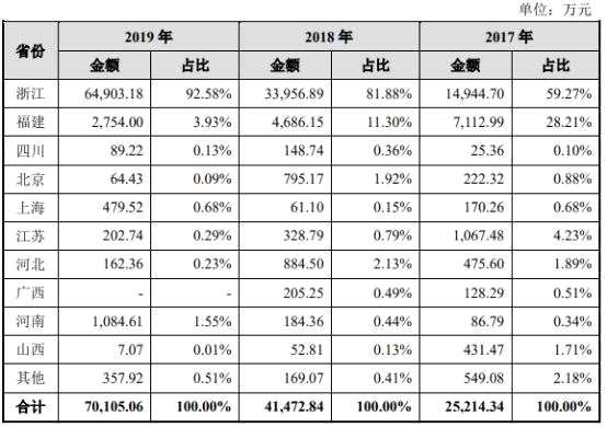宏力達的業(yè)務(wù)越來越集中在浙江省。2017年至2019年,宏力達在浙江省實現(xiàn)的銷售收入占主營業(yè)務(wù)收入的比例分別為59.27%、81.88%和92.58%。