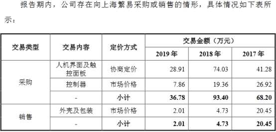 2013年至2017年,步科股份向上海繁易銷售金額分別為34.73萬元、62.35萬元、44.42萬元、7.57萬元、20.45萬元、4.73萬元和2.01萬元;向上海繁易采購金額分別為32.80萬元、49.99萬元、93.40萬元、18.02萬元、68.20萬元、93.40萬元和36.78萬元,占當(dāng)期采購總額的0.47%、0.59%、1.24%、0.18%、0.40%、0.50%、0.19%。
