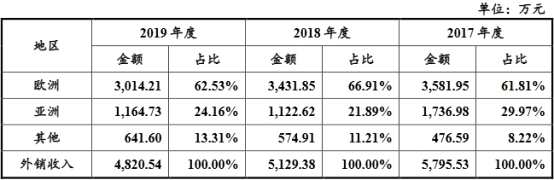 步科股份存在境外銷售情形。2017年至2019年,其外銷收入分別為5795.53萬元、5129.38萬元和4820.54萬元,占比分別為18.95%、16.19%、14.03%。