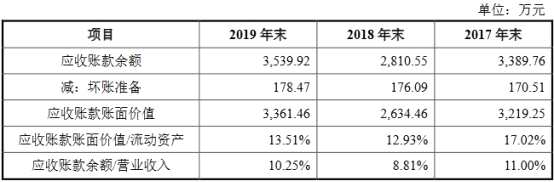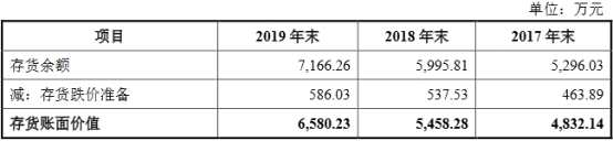2017年至2019年,該公司存貨跌價準備分別為463.89萬元、537.53萬元和586.03萬元,占存貨賬面余額的比例分別為8.76%、8.97%和8.18%。同期,同行業(yè)可比上市公司計提的平均存貨跌價準備分別為1.79%、2.14%和6.17%。
