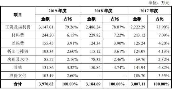 2017年及2019年,步科股份研發(fā)人員工資及福利費分別為2222.29萬元、2486.24萬元和3147.01萬元,占研發(fā)費用的比例分別為73.90%、78.07%和79.26%;材料費分別為213.12萬元、229.82萬元和244.20萬元,占研發(fā)費用的比例分別為7.09%、7.22%和6.15%;差旅費分別為126.24萬元、124.34萬元和155.45萬元,占研發(fā)費用的比例分別為4.20%、3.90%和3.91%;折舊與攤銷費用分別為124.07萬元、115.12萬元和103.24萬元,占研發(fā)費用的比例分別為4.13%、3.61%和2.60%;房租及水電費用分別為69.76萬元、78.32萬元和85.57萬元,占研發(fā)費用的比例分別為2.32%、2.46%和2.16%;其他費用分別為144.94萬元、150.84萬元和131.86萬元,占研發(fā)費用的比例分別為4.82%、4.74%和3.32%。