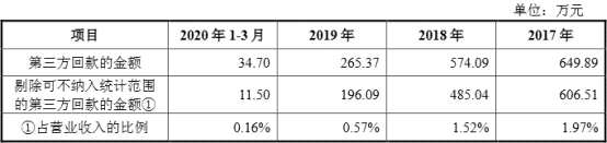 2017年、2018年、2019年和2020年1-3月,步科股份第三方回款的金額分別為649.89萬元、574.09萬元、265.37萬元和34.70萬元,剔除可不納入統(tǒng)計范圍的第三方回款的金額分別為606.51萬元、485.04萬元、196.09萬元和11.50萬元,占營業(yè)收入的比例分別為1.97%、1.52%、0.57%和0.16%。