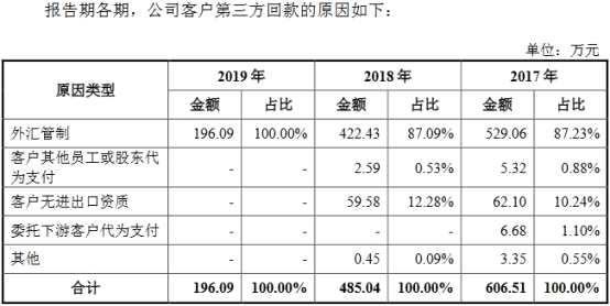 該公司稱,報告期內(nèi),客戶通過第三方付款的情形,主要系外匯管制原因,公司部分客戶所在國受到經(jīng)濟制裁或當(dāng)?shù)卣鲇谄胶鈬H支出的考慮,對本國外匯進出實行審批和限制,部分客戶出于便捷考慮,在與公司的交易中采用了第三方回款的方式,存在合理性。第三方回款的付款方與發(fā)行人及其控股股東、實際控制人、董事、監(jiān)事、高級管理人員或其他關(guān)聯(lián)方不存在關(guān)聯(lián)關(guān)系或利益安排的情形。報告期內(nèi),公司不存在因第三方回款導(dǎo)致貨款歸屬糾紛的情況。