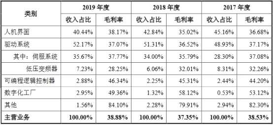2013年至2019年,該公司人機界面毛利率分別為47.06%、45.83%、40.20%、39.13%、36.68%、35.02%和38.17%;伺服系統(tǒng)產(chǎn)品毛利率分別為34.28%、32.54%、36.26%、39.80%、37.08%、35.79%和37.77%;低壓變頻器毛利率分別為18.38%、17.72%、25.04%、31.67%、32.26%、32.01%和28.25%。