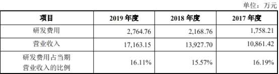 2014年至2019年,盈建科研發(fā)投入分別為835.45萬(wàn)元、1161.38萬(wàn)元、1320.16萬(wàn)元、1758.21萬(wàn)元、2168.76萬(wàn)元、2764.76萬(wàn)元;占當(dāng)期營(yíng)業(yè)收入的比例分別為19.39%、19.56%、16.44%、16.19%、15.57%、16.11%。