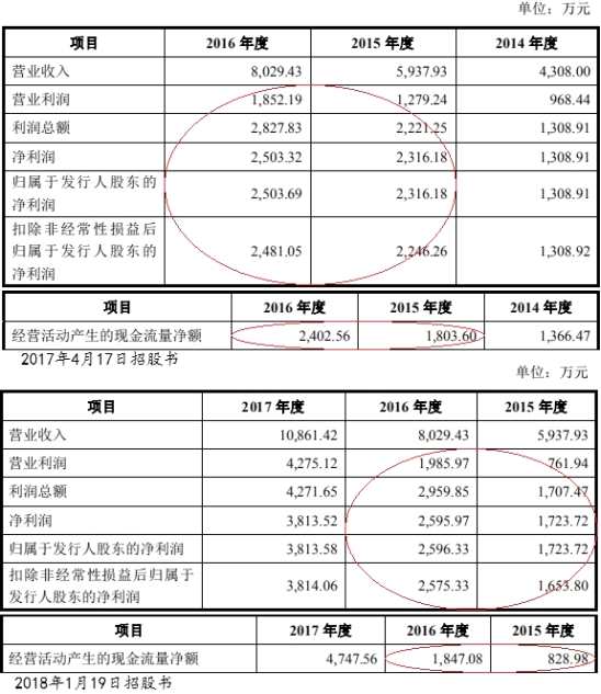 2015年、2016年?duì)I業(yè)利潤(rùn):2017年4月17日招股書分別為1279.24萬(wàn)元、1852.19萬(wàn)元;2018年1月19日招股書分別為761.94萬(wàn)元、1985.97萬(wàn)元;分別相差517.3萬(wàn)元、133.78萬(wàn)元;