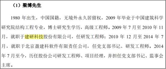 監(jiān)事會(huì)現(xiàn)任成員中,梁博曾任建研科技研發(fā)工程師;李保盛曾任建研科技銷售員、經(jīng)理。梁博2014年7月至今,歷任盈建科研發(fā)工程師、項(xiàng)目經(jīng)理,并擔(dān)任黨支部書記、監(jiān)事會(huì)主席;李保盛2014年7月至今,任盈建科營(yíng)銷總監(jiān)、監(jiān)事。