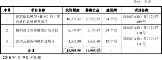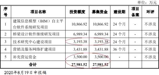 1.建筑信息模型(BIM)自主平臺(tái)軟件系統(tǒng)研發(fā)項(xiàng)目,投資額度1.09億元,募集資金1.09億元;2.橋梁設(shè)計(jì)軟件繼續(xù)研發(fā)項(xiàng)目,投資額度6989.34萬(wàn)元,募集資金6989.34萬(wàn)元;3.技術(shù)研究中心建設(shè)項(xiàng)目,投資額度3193.38萬(wàn)元,募集資金3193.38萬(wàn)元;4.營(yíng)銷及服務(wù)網(wǎng)絡(luò)擴(kuò)建項(xiàng)目,投資額度3431.88萬(wàn)元,募集資金3431.88萬(wàn)元;5.補(bǔ)充營(yíng)運(yùn)資金,投資額度3500.00萬(wàn)元,募集資金3500.00萬(wàn)元。